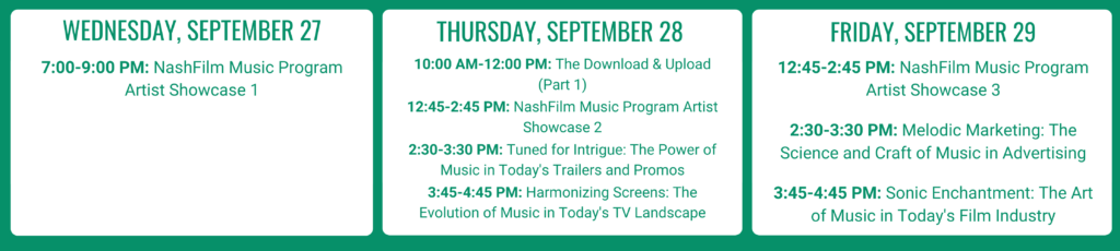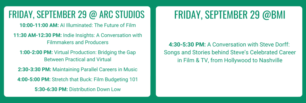 This year, the conference will take place Friday, September 29th, Saturday, September 30th and Sunday, October 1st with film-focused panels and events at Arc Studios (11 Willow St. #2, Nashville TN 37210) and BMI (10 Music Square E, Nashville TN 37203).